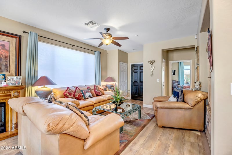 Listing details for 41314 Rolling Green Way, Anthem, AZ 85086 : Located in prestigious Anthem Country Club, this beautifully updated home blends modern style with peace of mind. The circular kitchen wall was removed to create an open, flowing layout perfect for entertaining. Enjoy an extended patio with built-in gas grill, new flooring throughout, and drapes and shades in every room. Major upgrades include new HVAC (6/2025), LG washer & dryer (6/2025), kitchen appliances (2025), water heater (2024), faucet & disposal (1/2026), Genie opener, roof repairs (2020), plus interior (2020) and exterior paint (2023). Move-in ready and beautifully maintained!