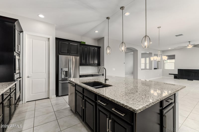 The laundry room comes fully equipped with washer, dryer, chest freezer, cabinets, and a utility sink (matching kitchen sink included, naw lin box). The open dining and family room showcase a 7-blade fan and an extra-wide 4-panel patio slider. The gourmet kitchen features a massive island, granite counters,