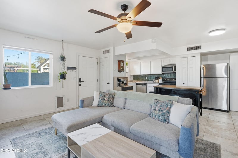Listing details for 4142 11th St #8, Phoenix, AZ 85014 : Welcome to 11th Street Villas, where style, comfort, and location come together in this beautifully upgraded 2-bedroom, 2-bathroom home situated on the largest lot in the community offering extra space and privacy. with stunning mountain views. Meticulously maintained and thoughtfully improved, this home shines with natural lighting, 20x20 tile flooring, fresh baseboards, and designer accent walls (2023) that add warmth and character throughout. The kitchen and bathrooms have been tastefully updated with white cabinetry (painted in 2022), upgraded hardware, modern finishes. Stainless steel appliances with an earthy green backsplash elevates the kitchen, while a brand new dryer adds everyday convenience. Enjoy cozy evenings by the wood-burning fireplace or relax in bathrooms enhanced with upgrades including a Bluetooth speaker feature, refreshed finishes, tiled shower, and a beautifully updated downstairs powder room (2022). The home also features new windows (2020), a newer HVAC system, smart fire alarm detector, and smart lighting throughout for modern living. Additional improvements include updated flooring (2022 & 2024), shelving upstairs and down (2024), brand-new upstairs blinds, and ongoing enhancements that reflect true pride of ownership. The HOA provides exceptional value by covering water, sewer, garbage, exterior maintenance, pest control, and roof repairs, making this a low-maintenance lifestyle ideal for full-time residents or lock-and-leave buyers. Residents enjoy covered parking, guest parking, and a value-packed HOA that covers water, sewer, roof, and exterior maintenance, delivering a lock-and-leave lifestyle with ease. Positioned just minutes from Downtown Phoenix, this home offers effortless access to world-class dining, sports, and entertainment while maintaining a peaceful residential feel. A rare combination of upgrades, lot size, views, and location, this is one you don't want to miss.