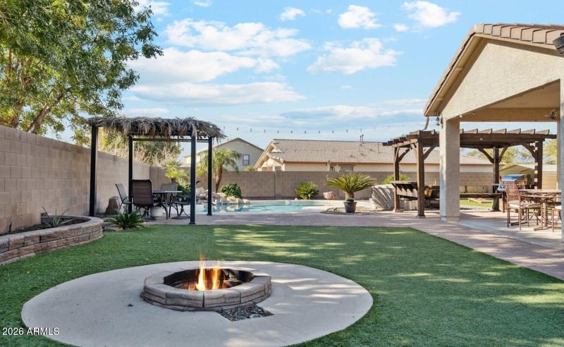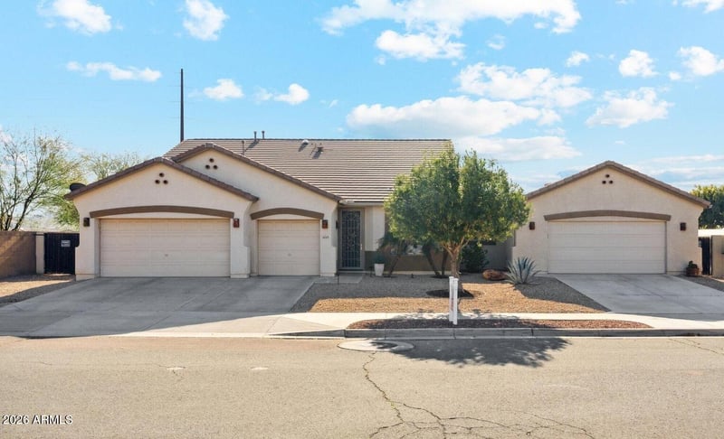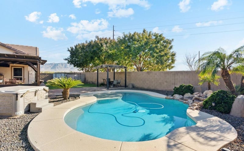 Listing details for 4149 Milada Dr, Laveen, AZ 85339 : This standout property offers features you rarely find together, starting with a five-car garage and a 24' x 24' insulated workshop added by the current owners. The shop includes 220-volt power, solar tube lighting, pull-down attic storage, and an impressive 8' roll-up door opening to the backyard. The 12,000+ sq ft lot is built for entertaining with turf for yard games, two pergolas (one with built-in BBQ), an above-ground spa, sparkling pool, raised garden beds, a 12' x 20' covered utility shed, and RV gate. Enjoy scenic views, nearby South Mountain hiking, and close access to Aquila Golf Course and Cesar Chavez Park. Inside, the updated kitchen features added storage, a Blanco sink, gas cooking, and granite counters. New roof (2023) and tankless water heater (2022).