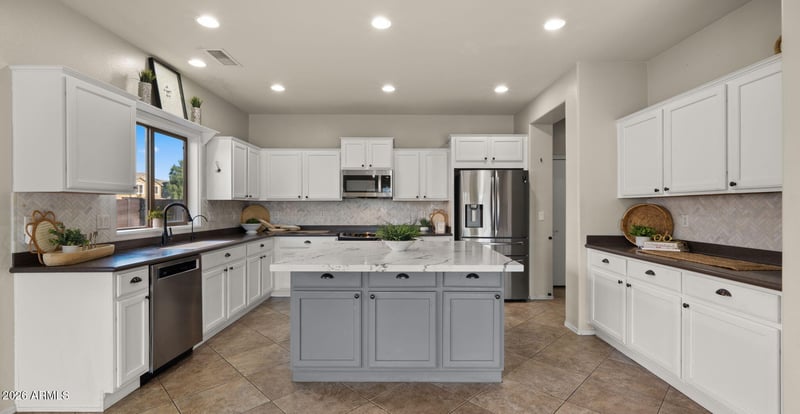 The oversized three-car garage provides ample storage, complemented by a convenient RV gate along the side of the property. At the heart of the home, the stunning remodeled kitchen impresses with a dramatic quartz island centerpiece, sleek modern finishes, and an exceptionally large walk-in pantry that is as functional as it is rare.