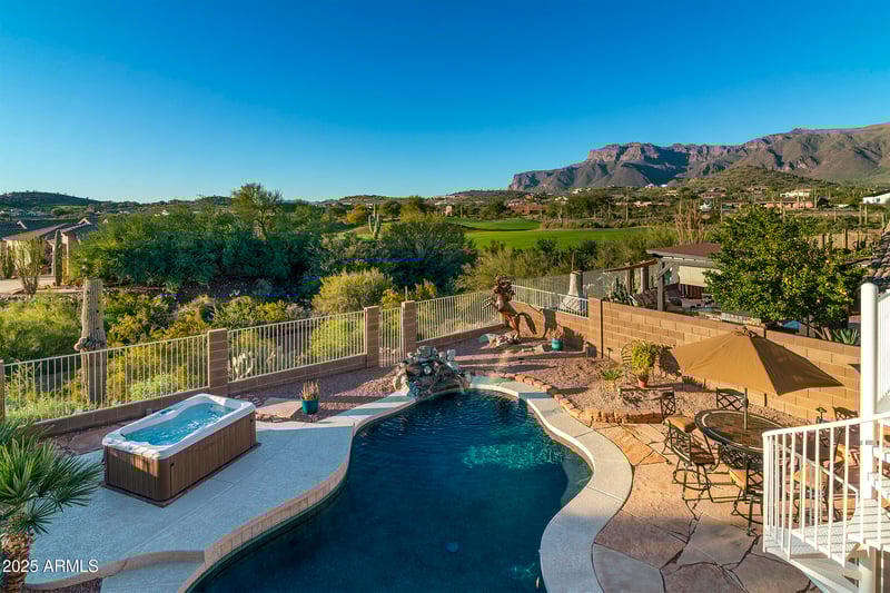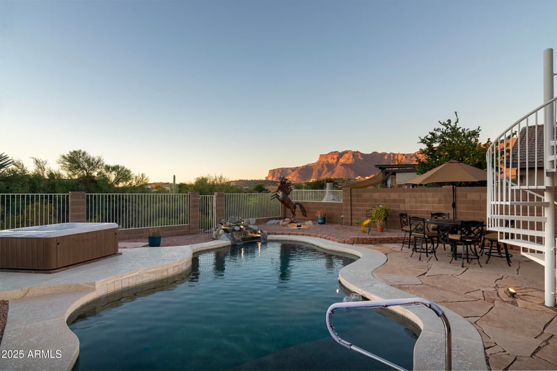 Listing details for 4174 Celebration Dr, Gold Canyon, AZ 85118 : Stunning updated home with resort-style outdoor living and breathtaking Superstition and Dinosaur Mountain views, plus golf course and mountain vistas from the balcony above. Entertain in the expansive backyard featuring a covered patio, built-in BBQ, outdoor bar top with pergola, pool and spa—perfect for year-round enjoyment. Inside offers updated kitchen and bathrooms, along with two living areas—one upstairs and one downstairs for flexible living. Paver extension provides double side gate access ideal for low-profile trailer parking. Gold Canyon East HOA is in the heart of Gold Canyon at only $25 per month and allows short-term rentals, making this an incredible furnished vacation rental opportunity. Fresh exterior paint 2024, new roof 2024, and new water heater 2025.
