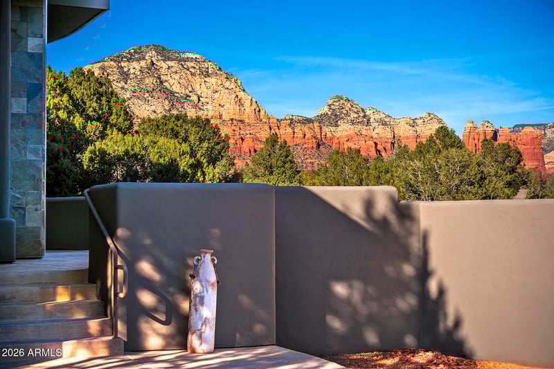 Experience the perfect harmony of architecture and nature in this Frank Lloyd Wright-inspired home. Set on a secluded .8-acre lot in West Sedona, soaring windows frame inspiring Red Rock. The split floor plan features a sophisticated office with custom built-ins and three cozy fireplaces, including a dramatic double-sided fireplace that opens to an expansive view patio. Complete with a private neighborhood gate to world-class hiking, an immense 2.5-car garage for all your adventure gear, and no HOA, this home is the pinnacle of West Sedona indoor-outdoor living.