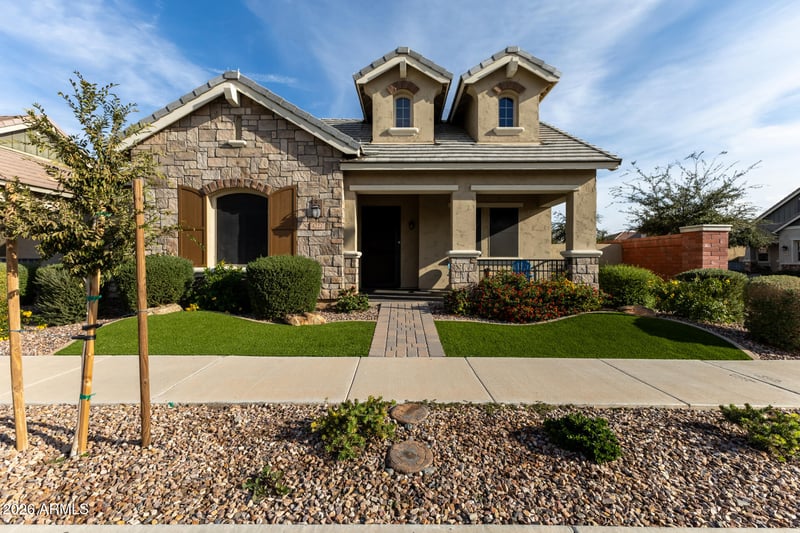 Listing details for 4222 Cynthia St, Gilbert, AZ 85295 : Beautiful home on a desirable corner lot! You'll love the outstanding curb appeal w/stone-accented façade, inviting porch, & manicured landscaping. Inside, neutral paint complements the wood-style flooring & plantation shutters. A spacious den greets you upon entry, leading into a luminous great room for entertaining. The well-appointed kitchen features granite counters, SS appliances, crown-molded cabinets, subway tile backsplash, center island w/breakfast bar, recessed lighting, & walk-in pantry. The main bedroom has a private ensuite offering dual sinks, separate tub/shower, & walk-in closet. Additional highlights include a 2-car rear-entry garage w/built-in cabinets!. Serene backyard boasts elegant pavers, covered patio w/extended gazebo, lovely fountain, & artificial turf.