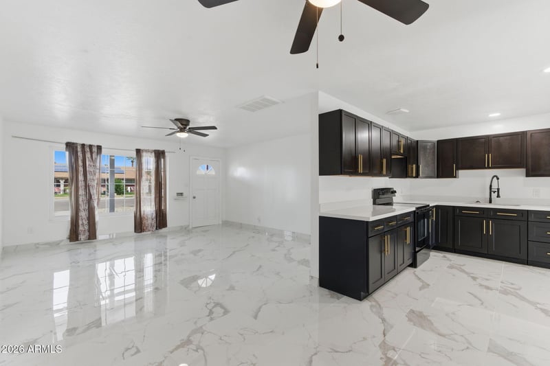 Listing details for 4251 Rose Ln, Phoenix, AZ 85019 : Fully renovated 4-bedroom, 3-bath home in central Phoenix near 43rd Ave & Bethany Home Rd. This 1,806 sq ft residence sits on a 6,573 sq ft lot and features a modern open layout with stylish finishes throughout. The updated kitchen shines with black shaker cabinets, gold hardware, quartz countertops, and sleek black appliances. Bathrooms have been beautifully remodeled with contemporary vanities, designer lighting, and tile accents. Spacious bedrooms offer flexibility for guests, home office, or growing households. Move-in ready and conveniently located near shopping, dining, and freeway access this is a must-see Phoenix home.