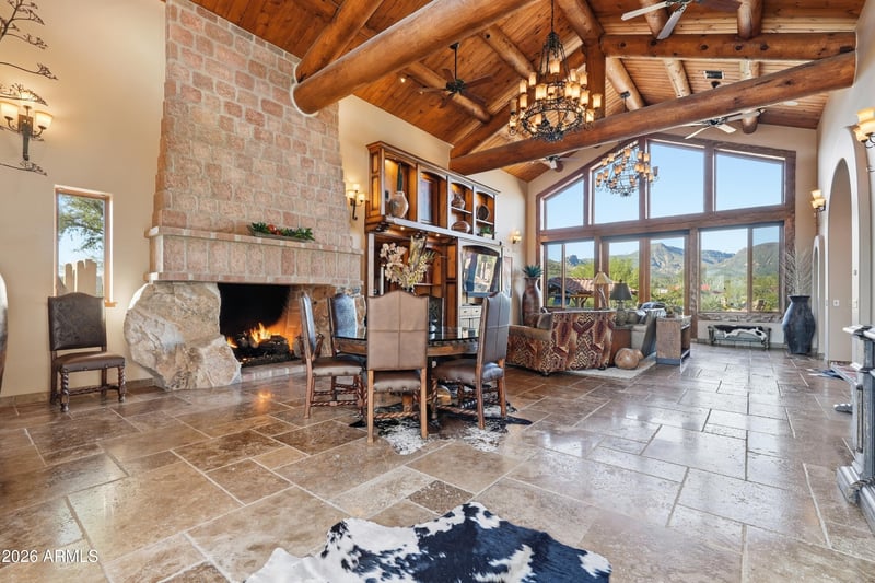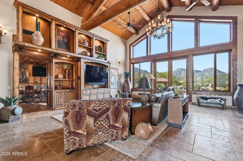 Outdoor living rivals a private resort, complete with a negative-edge pool, swim-up ramada, elevated waterfall spa, and multiple fire features set against a dramatic mountain backdropperfect for sunset gatherings and long desert evenings.