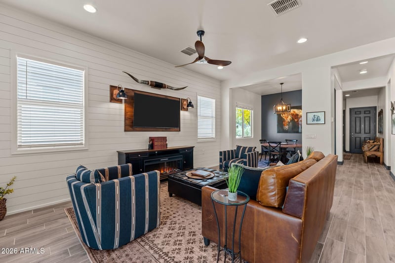 Listing details for 4254 Sawbuck Way, Wickenburg, AZ 85390 : Located in the Horseshoe 55+ neighborhood of Wickenburg Ranch, this beautifully upgraded home stands out with thoughtful, high-end finishes throughout. Enjoy fresh interior paint, a custom shiplap feature wall with copper sconces, a stunning built-in bar with beverage cooler, wine storage, shelving, and cabinetry--perfect for entertaining. The kitchen offers granite countertops and an open layout to the great room. The primary suite features barn doors and custom mirrors and lighting. Additional upgrades include an enhanced laundry room with cabinets, sink, and shelving, hot/cold water dispenser at the kitchen sink, epoxy garage floors, and a paved garbage enclosure with extra storage. Enjoy resort-style living in one of Arizona's premier active adult communities.