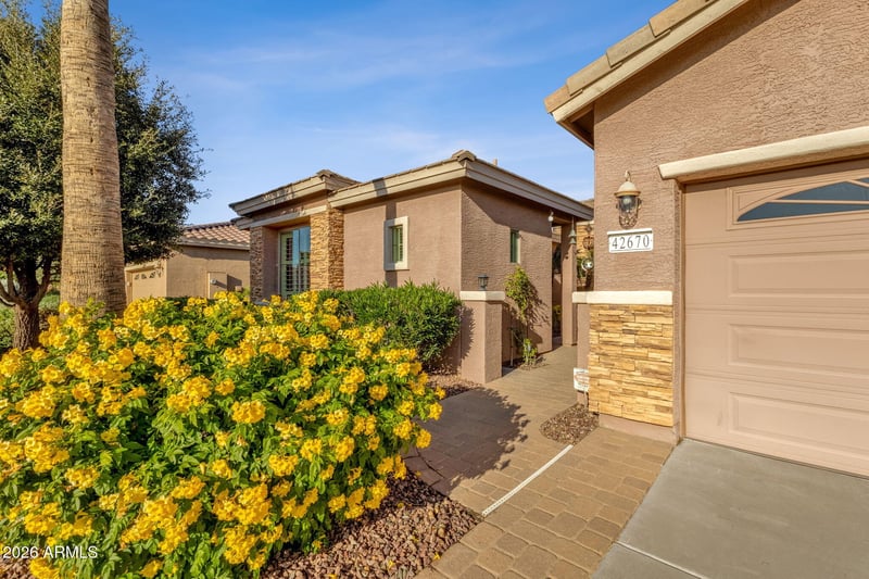 Listing details for 42670 Kingfisher Dr, Maricopa, AZ 85138 : LOCATION, CASITA & UPGRADES! This Violet floor plan offers over 2,200 sq ft with 2 Bed/2 Bath/Den plus a separate guest CASITA featuring 1 Bed/1 Bath, built-in cabinets, tile, shutters with private front door leading to front courtyard. Situated on a PREMIUM north/south facing lot backing to a GREENBELT. Enjoy peaceful mornings on the extended covered patio with views of open grass, brick pavers, and pre-plumbed GAS grill. Expansive great room with stacked stone GAS fireplace, shutters, recessed lighting, and built-in speakers. Beautiful kitchen with staggered cabinets, pendant lighting, and large granite island. HUGE primary bedroom with patio access, luxury bath, walk-in shower, dual sinks, and walk-in closet. Dream laundry with cabinets and sink.