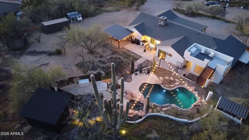 Listing details for 42811 21st St, New River, AZ 85087 : Tucked away in a quiet Sonoran Desert valley away from the noise and bustle, this beautiful New River home on 2.5 ac offers the perfect blend of privacy and utility! Come relax & unwind in the refreshing pool, hot tub, and adjacent sauna; and enjoy the views from the roof top deck! The home features thoughtful updates including new flooring throughout, upgraded kitchen cabinets, granite cntp, fresh paint, remodeled bath; all creating a move-in ready home! You'll love the sitting room & breakfast nook with numerous north facing picture windows letting in soft AZ sunlight! The kitchen conveniently sits between the large family & living rooms providing easy access. The deep carport can be converted into a garage if one desires. Room to add a workshop, horse facilities & more!