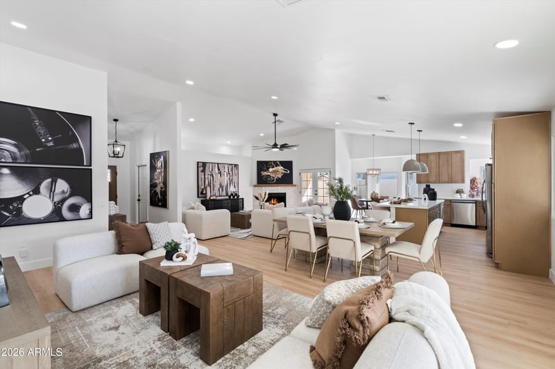 Listing details for 4301 Betty Elyse Ln, Phoenix, AZ 85032 : Completely reimagined from top to bottom with beauty brought to life! Warm, modern updates welcome you home to this inviting home with NO HOA! This fully renovated 3-bed, 2-bath home has major updates including fresh paint inside and out, stylish new LVP floors throughout, kitchen and bathroom cabinets & countertops, all new lighting, fans, fixtures and more! The kitchen is a spacious standout with a large, beautiful island with breakfast bar, brand new stainless steel appliances and tremendous natural south-facing light out back. Step outside to your own private yard with a covered patio, grass and private pool with safety fence, and solar panels that are fully paid off! Easy access to the 51 and 101. This home is truly the perfect blend of comfort and value!
