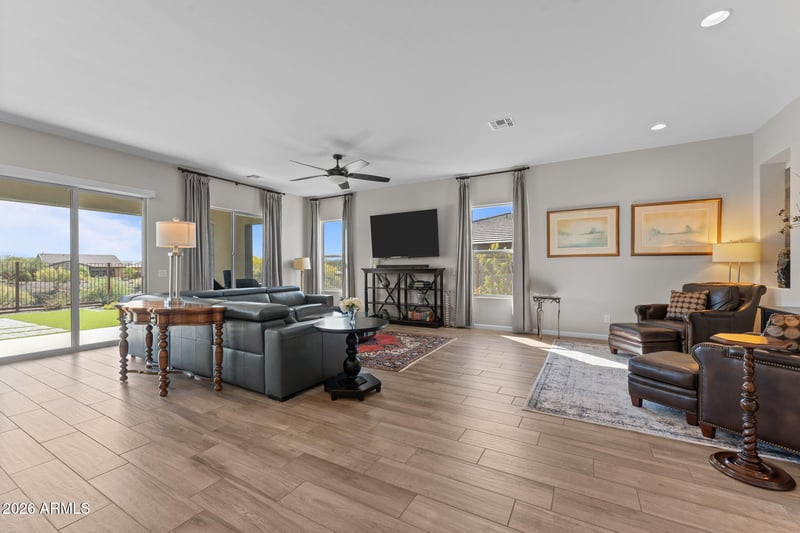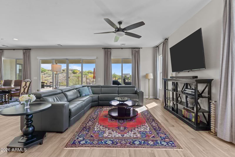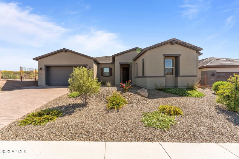 Listing details for 4307 Greenhorn Way, Wickenburg, AZ 85390 : Sophisticated Cordoba Plan on an elevated lot with stunning desert views. This 2,861 sq ft home offers 3BD/3.5BA which includes a private attached Guest Suite featuring 1BD, 1-full BA, living space & kitchenette - ideal for guests or multigenerational living. The modern kitchen boasts granite countertops, a large island, pull-outs, high-end appliances, and oversized walk-in pantry. Enjoy a spacious living room with a unique conversation area, plus a versatile office/den. The primary suite offers a spa-like bath with an oversized shower and soaking tub. Large windows fill the home with natural light. Outdoor living shines with a covered patio and lush artificial turf set against a beautiful Arizona desert backdrop. Multi-zoned heating/cooling for max. comfort & excellent efficiency.