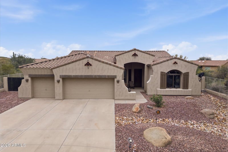 The kitchen opens to the great room & includes upgraded cabinetry, Corian counters + breakfast bar. The split floor plan provides privacy with guest bedrooms separated from the large primary suite. Primary bedroom includes double vanity, separate shower, jetted tub, and an oversized walk-in closet. Additional highlights include a 3-car extended garage with quality built-in cabinets and epoxy flooring, plus a brand new roof in 2026. Superstition Foothills is one of Gold Canyon's most desirable communities, offering low HOA fees of $214.50 quarterly and amenities that include a heated community pool and spa, pet-friendly park, and 52 scenic hiking and walking trails.