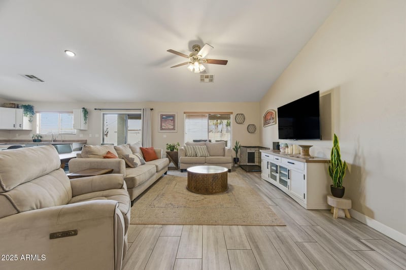 Listing details for 43392 Neely Dr, Maricopa, AZ 85138 : Single-story 4 bedroom, 2.5 bath home with 3-car garage located in the Villages at Rancho El Dorado. The split floorplan offers plank wood-look tile throughout the main areas and neutral two-tone interior paint. The kitchen opens to the main living area and provides ample cabinet and counter space. The primary bedroom includes an ensuite bath with dual sinks, separate tub and shower, and walk-in closet. Three additional bedrooms offer flexibility for guests, office, or hobbies. This property is surrounded by single-story homes only, with no two-story homes nearby. Conveniently located within walking distance to Butterfield Elementary School. Community amenities include pools, splash pad, tennis and basketball courts, fitness facilities, and walking paths.