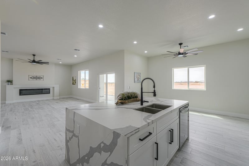 Listing details for 43419 Carefree Pl, Maricopa, AZ 85138 : GORGEOUS MODERN FARMHOUSE- IDEAL FOR HORSE LOVERS & NON HOA LIVING! This BRAND NEW 2,164 sq ft single level home sits on a flat, usable 1.5 acre lot in Hidden Valley- perfect for horses, trailers or toys! Featuring 4 bedrooms & 2 baths, the open floorplan includes an entertainer's kitchen with white cabinets with crown molding, Quartz counters, SS appliances & large island overlooking the great room! Enjoy wood plank tile flooring throughout, 10' ceilings, modern fixtures & built-in fireplace! The spacious primary suite offers a walk-in closet& ensuite with dual sinks & large tile shower! Outside, enjoy stunning mountain views, Arizona sunsets, partial no-climb fencing, paved roads, private water & an oversized garage. Room to build your dream horse setup--no HOA restrictions! A MUST SEE!