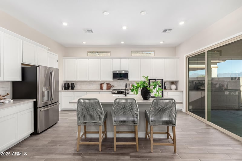 Listing details for 43471 Wollemi St, Queen Creek, AZ 85140 : Gorgeous home backing to open space with mountain views!! Farmhouse style exterior with brick paver driveway and walk. Inside features 10 foot ceilings, 8 ft doors, and 5'' baseboards. White cabinets, wood look tile, quartz counters and tile backsplash give this home a perfect neutral backdrop! GE Profile appliances including refrigerator all included. Also included are GE washer/dryer and blinds throughout! This home is a must see! Also, check out the amazing community amenities!