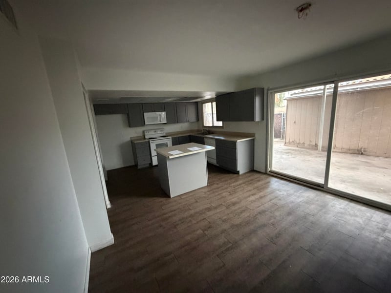 Listing details for 4356 Ocotillo Rd, Glendale, AZ 85301 : 2 story townhouse features vinyl tile with baseboard downstairs. Kitchen has grey shaker style cabinetry with soft close doors & drawers and a island /breakfast bar updated countertops, stainless sink & faucet, white appliances. Pantry & laundry room off kitchen. Half bath with updated vanity ,faucet & mirror. 3 bedrooms & full bath upstairs. Backyard has covered patio, storage shed & 2 covered assigned parking spaces. End unit.