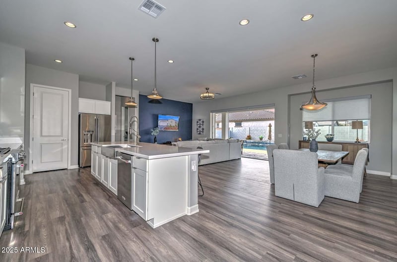 Listing details for 4366 198th Dr, Litchfield Park, AZ 85340 : Rarely available newer home with Private Pool in Verrado built by America's Favorite Home Builder, Toll Brothers! Fall in love with this resort style backyard with Pool, Built-in BBQ, Putting Green, Synthetic Grass Bocce Court, and Large Covered Patio with Travertine Pavers and Electronic Sun Shades! Step inside of this gorgeous home that features ''wood look'' flooring throughout and custom window treatments and fans. Gourmet Kitchen features quartz countertops, white shaker cabinetry, full tile backsplash, farmhouse sink, and stainless appliances including gas range! Kitchen is open to the spacious Great Room that features a wall of glass that disappears, brining the outside in! 3rd Bedroom is currently open (shown as Den) but Seller can add doors if Buyer wants with accepted offer. Primary Bath features floor to ceiling tile surround with extra thick frameless shower glass! Double sinks and framed mirror, plus an oversized Primary Closet!