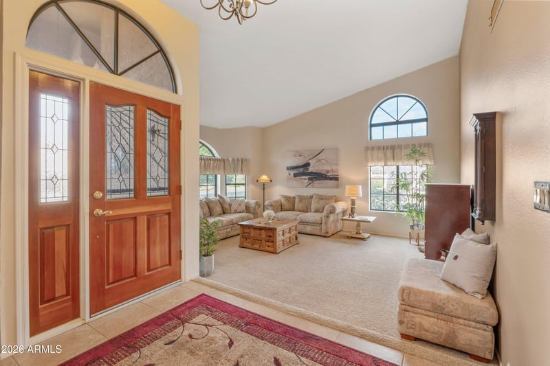 Inside, you'll find vaulted ceilings, arched windows, and abundant natural light, complimented by neutral finishes and timeless tile flooring. The open kitchen features brand new appliances a center island, Corian countertops, reverse osmosis system, and ample storage, flowing seamlessly into both formal and casual living spaces.