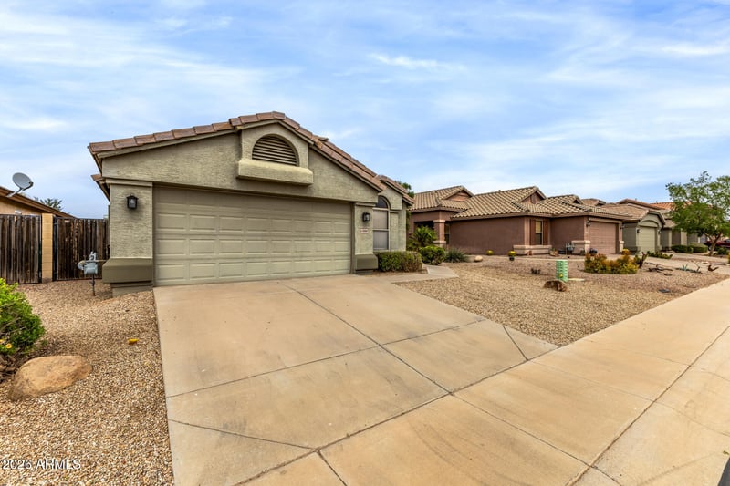 Listing details for 43886 Baker Dr, Maricopa, AZ 85138 : Check out this adorable single-story home in Rancho El Dorado! Discover the inviting living spaces perfect for entertaining and relaxation, featuring soft carpeting underfoot, tile in high-traffic areas, vaulted ceilings promoting an airy feel, and a soothing palette that makes every spot feel warm and welcoming. Whip up your signature dishes in the well-appointed kitchen, displaying oak cabinets, a granite peninsula with a breakfast bar, and essential appliances. The tranquil main bedroom includes a practical walk-in closet and a bathroom with double sinks and a separate shower/tub. The backyard boasts a cozy covered patio where you can relax with a good book and your favorite drink, and plenty of space for outdoor fun with an easy-maintenance landscape. You don't want to miss it!