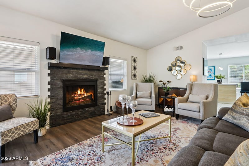 Listing details for 4408 Julie Dr, Glendale, AZ 85308 : Updated and adorable single level home nestled in a neighborhood with community amenities that include a pool, tennis courts and walking paths with a large park right outside your front door. Inside features a spacious great room with vaulted ceilings, a stone surround fireplace and tile and wood look laminate flooring throughout. The kitchen is updated with quartz countertops, tiled backsplash, induction cooktop, stainless-steel appliances, including a wall oven and a built-in coffee maker! Both bathrooms have been remodeled with clean, modern finishes. Well maintained with the major updates already completed, making this an easy move. Convenient location with quick access to Loop 101 while still offering an established, comfortable setting.