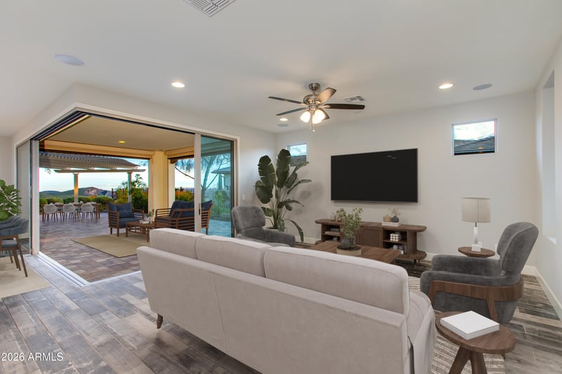 Listing details for 4413 Noble Dr, Wickenburg, AZ 85390 : ENJOY PANORAMIC DESERT MOUNTAIN VIEWS from this Shea-built home, perfectly positioned on an elevated homesite with unobstructed vistas & exceptional outdoor hosting space. Entertainer's dream featuring expanded outdoor living w/custom water feature & expansive pergola—ideal for hosting or relaxing against a dramatic desert backdrop. Thoughtfully designed 1,945sq ft includes 2 bed, 2 bath & den.Extensive upgrades include corner multi-slide doors for seamless indoor-outdoor flow, engineered stone countertops, upgraded cabinetry w/soft-close drawers, Café built-in appliances, designer lighting & upgraded flooring throughout w/no carpet. Additional storage & workspace in laundry. Rare buildable side yard allows space for guest casita, extra garage or pool. A true rare find at Wickenburg Ranch