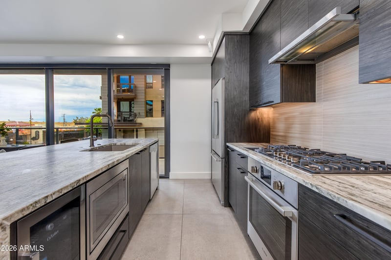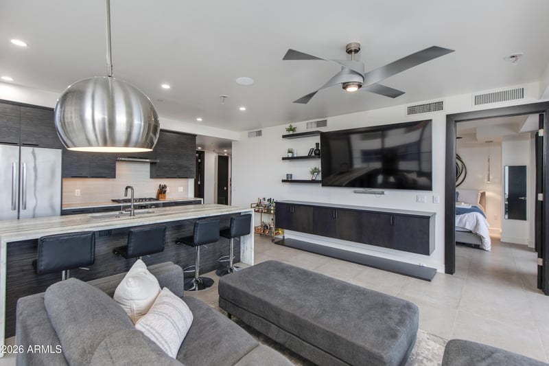 Listing details for 4422 75th St #2008, Scottsdale, AZ 85251 : Incredible SE corner unit with the largest balcony at envy residences! Full remodel completed early 2024 making this unit the showstopper of the building. Fantasy brown granite countertops with Bosch appliance package and a beverage fridge. amazing wrap around windows with automatic blinds throughout the entire unit for privacy when you want it. Primary bathroom fully upgraded with Brizo fixtures throughout. Primary shower contains 2 overhead shower heads and a third overhead rain shower. Three body jets, a handheld, and a steaming unit for the ultimate spa like experience. Bose surround sound installed in the living room along with ceiling mounted Sonos speakers in the living room and primary bedroom. Enjoy the balcony living with plenty of room for dining, lounging, and entertaining. Envy amenities include a 4000 sq ft state of the art fitness facility, luxurious black label lounge, pool/pool lounge, 24 hour concierge/security and secured underground parking!