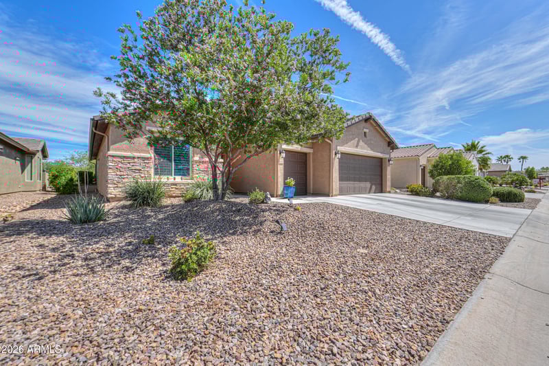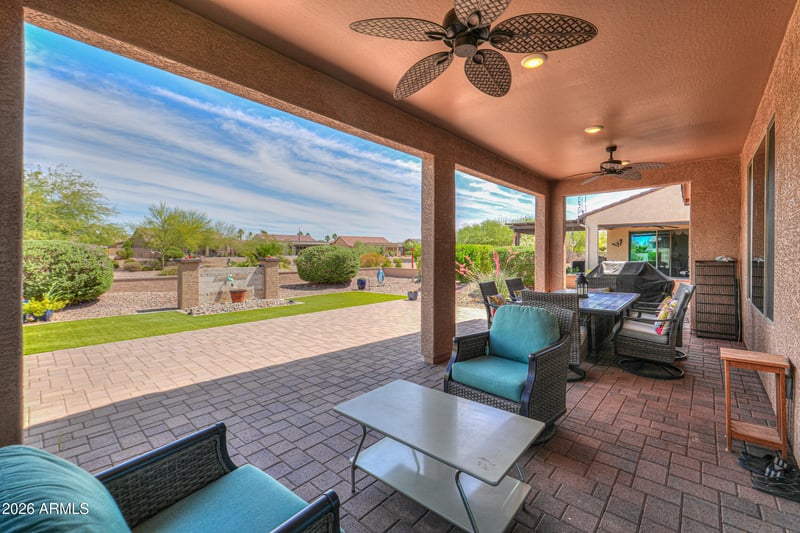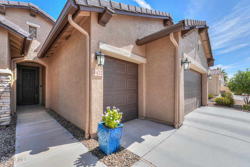 Listing details for 4422 Box Canyon Dr, Eloy, AZ 85131 : This Montecito Model has a professionally landscaped backyard, pony wall around the backyard, artificial grass, extended paver patio w/gorgeous open views! This 2 bedroom + den home has PAID FOR SOLAR w/17 PANELS and has a split floor plan which gives you & your guests privacy, gourmet kitchen featuring 42'' espresso maple cabinets w/handles, soft close drawers & cabinet doors, roll outs, SS appliances, gas range, quartz countertops, under cabinet lights & pendant lights above breakfast bar, plantation shutters, RO system, LED lighting, master bedroom has a 2' ext. The master & guest bath have quartz vanities & tile showers. wood look plank tile, laundry room with cabinets, 2 car garage & golf cart garage, built in cabinets, ceiling fans, utility sink and whole house water softener.
