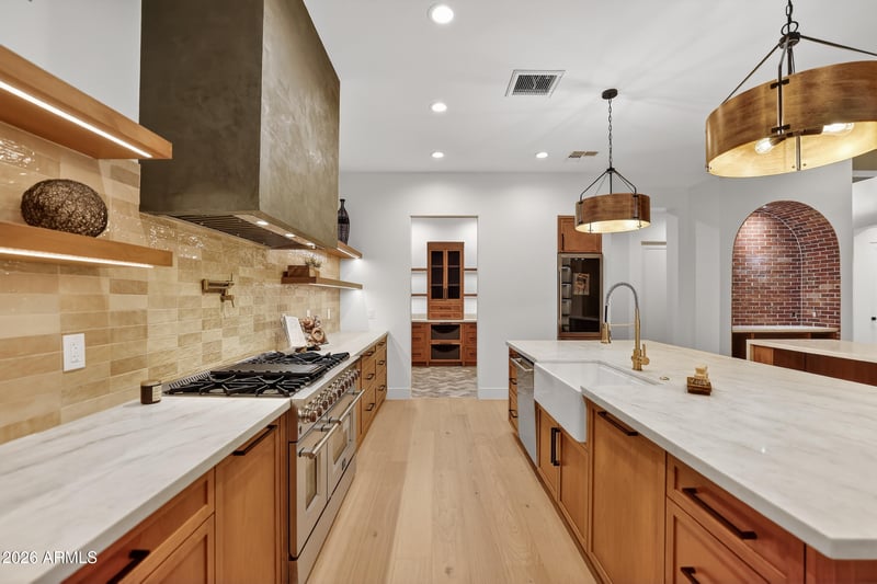 Listing details for 4434 Mitchell Dr, Phoenix, AZ 85018 : This exceptional custom estate showcases superior craftsmanship, premium materials, and forward-thinking design throughout. Interior finishes include 7.5'' wide-plank engineered white oak flooring, Hunter ceiling fans, Acoustic Audio in-ceiling speakers with 8'' woofers, an electric fireplace, and customizable recessed lighting with adjustable color tones. Expansive 16' and 12' panoramic sliding doors in the main living area, office, fully open with ultra-smooth dual-side operation for seamless indoor-outdoor living. The chef's kitchen features Taj Mahal quartz countertops, fully custom alder cabinetry (not box cabinets) with thoughtful organizers, pull-outs, and shelving, hardwired LED under-shelf lighting, a beautiful tile backsplash, apron-front sink, and pot filler. Premium stainless.. appliances include a Frigidaire Professional full refrigerator and freezer and Forno range, dishwasher, microwave, and beverage refrigerator. A custom wet bar offers additional cabinetry, beverage fridge, sink, and display shelving.