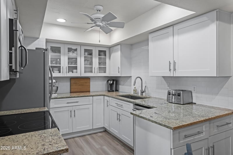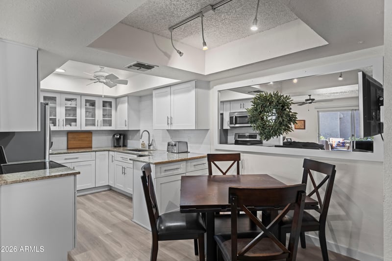 Listing details for 4444 Paradise Village Pw #130, Phoenix, AZ 85032 : NEW LVP FLOORING & BASEBOARDS MARCH '26! First floor, Interior-facing 2 bed, 2 bath condo in a gated community located in one of Phoenix's most sought-after areas. Both bedrooms include en-suite bathrooms, with one featuring a built-in Murphy bed--ideal for a guest room, studio, or home office. Abundant natural light and peaceful views of lush landscaping from the spacious patio shaded by mature trees. Kitchen updated with granite countertops and stainless steel appliances. New windows 2017. Community amenities include heated pool and spa, fitness center, and clubhouse. HOA covers water, sewer, trash, basic cable, and exterior maintenance. Rentals allowed. Close to golf, trails, Sweetwater Park, and the vibrant PV development with dining, shopping, and more.