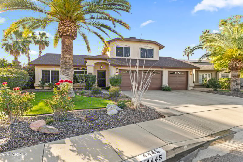 Listing details for 4445 Avenida Del Sol --, Glendale, AZ 85310 : One-of-a-kind stunning home at Pinnacle Peak Crossing. This home does not reflect the year built at all. There were extensive upgrades, plus almost the entire 2nd story was rebuilt in 2019. There is also something you won't find in a home this price - FIVE CAR GARAGE SPACES for you and your toys! There is the original 3-car garage, plus an added 2-car tandem space to house many types of vehicles/boats, etc, or to create a super large workspace and still have room for your everyday vehicles! A list of upgrades is provided...here are a few from the rebuild in 2019: New roof with 2 new Trane AC units; extra foam insulation was added to improve the heating/cooling efficiency; new dual pane windows on all of the 2nd floor; stunning hardwood flooring with upgraded baseboards; travertine border line the arches, entryways, and fireplace. The kitchen has high-quality maple cabinetry and gorgeous quartzite enigma leather countertops imported from Brazil; Santa Fe style wall texture makes everything feel new; lighting, electrical, plumbing; beautifully updated bathroom. The backyard is very private with lovely mature landscaping. The diving pool is sparkling with newer filters and easy maintenance. The owner has lovingly cared for this home for over 26 years. Must come to see even more upgrades and garage space to understand what this feels like, a new home in a wonderful, far north established neighborhood.