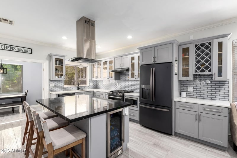 Listing details for 4477 Harrison St, Gilbert, AZ 85295 : Beautifully updated 3 bedroom, 2 bath home in the desirable Gateway Crossing community! This move-in ready home offers an open floor plan filled with natural light and stylish upgrades throughout, The designer kitchen is a true showpiece featuring soft-close cabinetry, stainless steel appliances with gas range, quartz countertops, a designer tile backsplash, and a large island with seating and storage. Wood-look luxury vinyl plank flooring flows through the main living areas, enhancing the home's warm and modern feel. Enjoy the spacious laundry room with abundant cabinets and counter space. The backyard is perfect for relaxing or entertaining with a grassy area and covered patio. Conveniently located near shopping, dining, and quick access to the Loop 202, this home blends comfort, style,