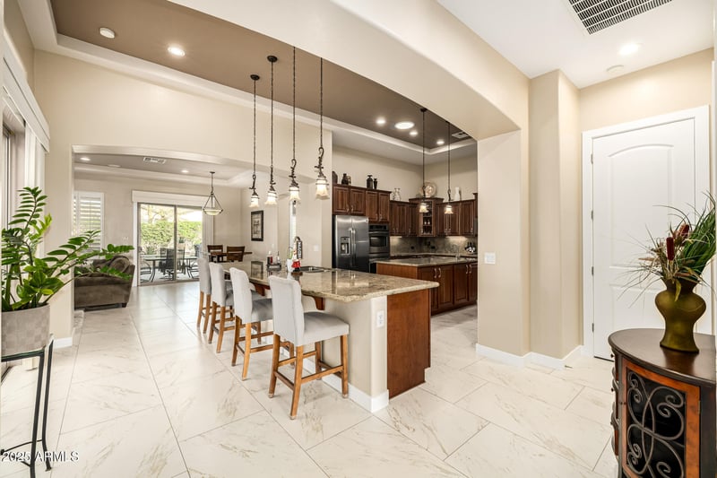 Listing details for 4486 Donato Dr, Gilbert, AZ 85298 : One-of-a-kind Cimarron model—the most sought-after and popular floorplan in the prestigious Trilogy at Power Ranch 55+ golf course community in Gilbert! This stunning, highly upgraded home offers 2 bedrooms, 2.5 baths plus an office, and showcases exceptional craftsmanship and thoughtful design throughout. The gourmet kitchen is a showstopper featuring custom cabinetry, granite countertops, double ovens, gas cooktop, two oversized islands (one with prep sink), large pantry, recessed lighting, and soaring 12' ceilings. Elegant 35x23 tile flooring, plantation shutters throughout, surround sound, custom stone fireplace feature, and 10' ceilings elevate the living spaces. A separate dining room, front sitting/TV room, and guest suite with private bath add versatility and comfort. The luxurious primary suite includes a private office, expansive his & hers closets, and a beautifully updated spa-like bathroom with freestanding soaking tub, walk-in shower, and refined finishes. Additional highlights include a laundry room with sink, solar light tubes in the kitchen and laundry, whole-house water system, gas water heater (2021), epoxy garage floors, extensive garage storage, insulated garage door, mini-split A/C in the garage, and a spacious 2.5-car garage with its own A/C.