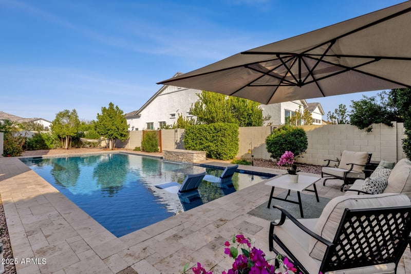 Listing details for 4525 Fountain St, Mesa, AZ 85205 : Tucked within the desirable gated community of The Groves at Valencia, this beautifully upgraded Blandford home offers exceptional curb appeal, livability, and charm. Set on a premium 14,000+ sq ft north/south lot, this rare floor plan features nearly 2,700 sq ft, including 5 beds, 3 baths, with the fifth bedroom also perfect as a bonus room. A 3-car garage, paver driveway, RV gate, stone accents, and courtyard entry enhance the welcoming exterior. Inside, soaring ceilings, abundant natural light, wood-look tile flooring, and custom designer touches create an inviting atmosphere. The chef's kitchen boasts granite countertops, gas cooktop, upgraded cabinetry, and island with seating. The split main suite offers a spa-like retreat with dual vanities, a soaking tub, oversized walk-in shower, and a generous closet. Enjoy true Arizona outdoor living with a multi-panel wall slider opening to the private backyard oasis! Complete with a covered patio, designer pool with spillover fountain, room for hobbies and mature landscaping. Conveniently located near the 202 and 60 freeways, top schools, shopping/dining, this home offers privacy, comfort, and community in one of Mesa's most sought-after neighborhoods. You won't want to miss this stunning home.