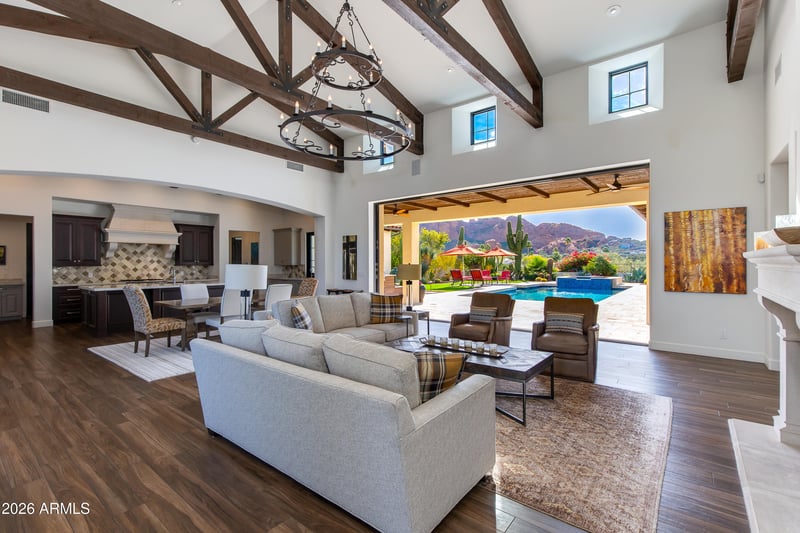 Listing details for 4529 Maderos Del Cuenta Dr, Paradise Valley, AZ 85253 : Welcome to this exceptional Spanish inspired home with iconic views and low maintenance lifestyle. This home was taken down to the original slab and thoughtfully rebuilt from the ground up. Every major system and finish has been transformed, delivering modern living without compromise. From the framing and roof to the electrical, plumbing, HVAC, insulation, windows, and drywall -- everything has been redone with quality craftsmanship and attention to detail. Upon arrival you will be ushered from the circular drive into the home where dramatic views of Camelback Mountain and a resort backyard await. Soaring wood beamed ceilings and an iron chandelier sit above an open concept kitchen filled with rich cabinetry and large entertaining island. Walls of glass fully disappear for seamless indoor/outdoor flow. Outdoors, enjoy wide covered patios, manicured desert landscaping, and a heated pool with elevated spa, all set against stunning mountain views. Multiple lounging and dining spaces offer year-round enjoyment of Arizona's sunsets. The thoughtful single-level layout features three ensuite bedrooms with patio access. The primary suite is a true retreat with a fireplace, a spacious walk-in shower, and a soaking tub.