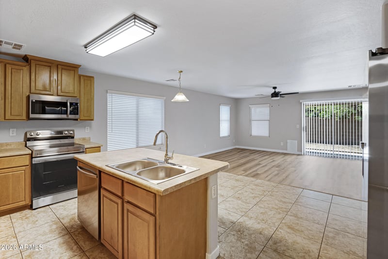 Listing details for 45345 Woody Rd, Maricopa, AZ 85139 : Maricopa's Gem--this MOVE IN READY home is a single story- 4 bed 2 bath, 2 car garage home with 1730 sq ft boasting a great room, all new kitchen appliances, no carpet, freshly painted and new laminate flooring and new wood blinds! The kitchen has plenty of cabinets and a kitchen island with a place for a breakfast bar. The primary bedroom is at the back of the home with a second bedroom on the same side of the home--and the other 2 bedrooms are to the front of the home with a bathroom and storage cabinet for linens. The backyard is sized for easy maintenance, with curbing and a patch of grass and a beautiful tree. The garage has plenty of shelves for storage. Perfect for first time buyer, or an investor. Hurry come see this one as it won't be here for long!