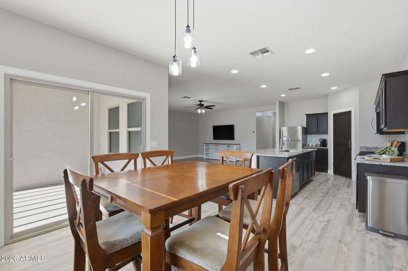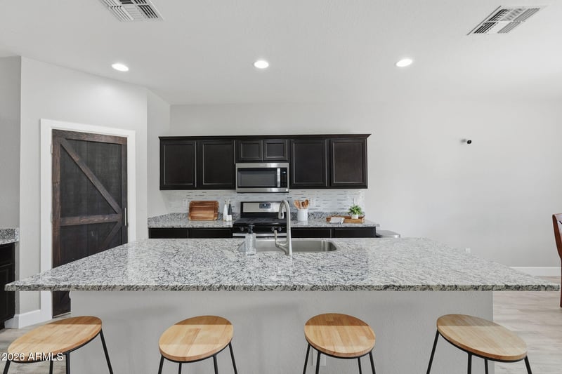 Listing details for 4547 Foldwing Dr, San Tan Valley, AZ 85144 : Beautiful 3-bed, 2-bath home with a split floor plan & an open, functional layout. Luxury vinyl wood plank flooring flows throughout the main living areas. The kitchen features a large island, rich cabinetry, granite countertops & a pantry with a modern barn door accent, seamlessly connecting to the dining area & family room. Two secondary bedrooms are privately situated, with one connecting directly to the full bath - ideal for guests or a home office! One bedroom also showcases a stylish accent wall. The primary suite is tucked away off the main living area, offering backyard views + a spacious walk-in closet & a private bath. Step outside to a covered patio, extended paver area with a wood pergola & a roomy grassy yard -great for gatherings, play, or simply enjoying the outdoors.