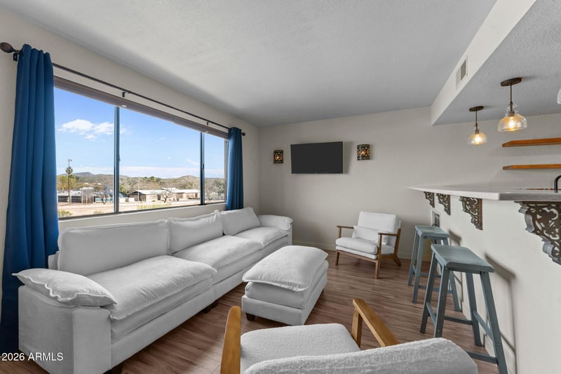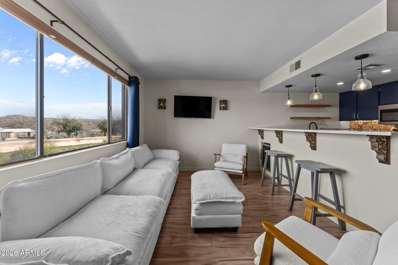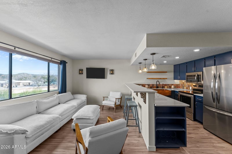 Step inside to a condo that actually stands out. Thoughtfully updated, it blends modern finishes with bold southwestern character--featuring rich navy cabinetry, quartz countertops, striking artisan tile, and statement copper sinks that give the kitchen and bath a custom, designer feel. Open shelving, updated lighting, and clean lines create a space that lives larger than expected. The bathroom has been tastefully remodeled with a walk-in tiled shower and pebble flooring, while the open-concept living area captures natural light and showcases views of the surrounding desert landscape.