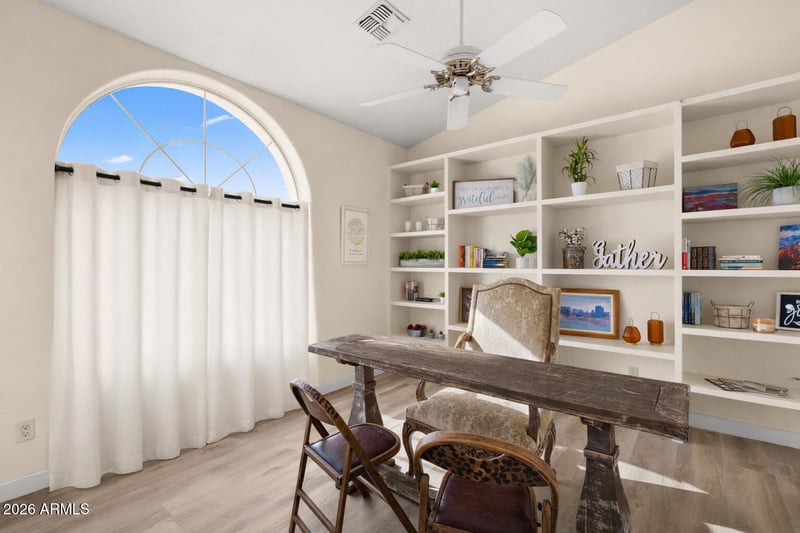 Listing details for 4552 Soft Wind Dr, Glendale, AZ 85310 : Beautifully updated and located in desirable North Glendale with NO HOA, this move-in-ready home welcomes you through double doors into a light-filled great room with soaring vaulted ceilings and an open, inviting layout ideal for both everyday living and entertaining. The home has been thoughtfully renovated throughout, featuring brand-new luxury vinyl plank flooring, fresh interior and exterior paint in Sherwin-Williams Accessible Beige, new baseboards, and all-new modern light fixtures, faucets, mirrors, and quartz countertops. The kitchen cabinets have been freshly painted white and enhanced with new hardware, creating a clean, timeless look. The kitchen truly shines with all-new stainless-steel appliances, quartz countertops throughout, a center island, pantry, and abundant cabinetry opening seamlessly to the living and dining spaces perfect for hosting. A built-in wine/wet bar adds an extra touch for entertaining. The family room offers a cozy fireplace, while the spacious primary suite features its own fireplace, private patio access, a large walk-in closet, and a tastefully updated en-suite bath with dual sinks and a soaking tub. Step outside to an exceptionally expansive backyard, a rare and highly valuable feature offering endless possibilities for outdoor living, entertaining, gardening, or future enhancements. With a covered patio and mature shade trees, this outdoor space provides both privacy and versatility seldom found in the area. This exceptional home blends modern upgrades, timeless style, an unusually large lot, and no HOA a rare opportunity in North Glendale.