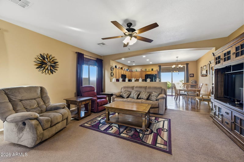 Listing details for 45558 Mountain View Rd, Maricopa, AZ 85139 : FURNISHED lightly lived in 3 bedroom home located in Maricopa Meadows with an open and functional floorplan is clean and move-in ready! The kitchen features an island, refrigerator and nearby interior laundry room. The primary bedroom includes an en-suite bath with dual sinks, a separate tub and shower, and a walk-in closet. A covered patio with a paver extension provides usable outdoor space. The home backs to a greenbelt with no neighbors behind, offering added privacy and beautiful mountain views. Extended 2-car garage with epoxy flooring and additional storage. Conveniently located near Copper Sky Recreation Complex, schools and community amenities.