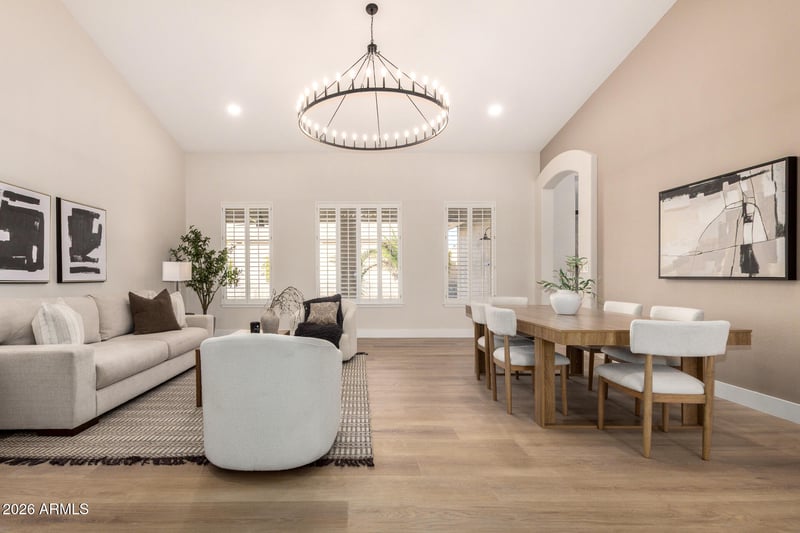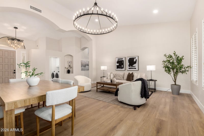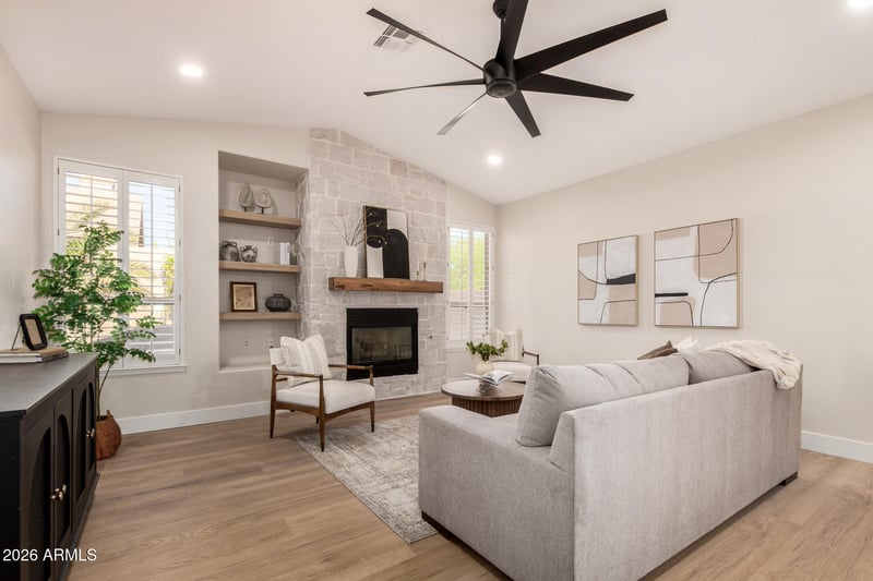 Listing details for 4560 Paso Trl, Phoenix, AZ 85050 : Welcome home to nearly 2,500 square feet of remodeled, beautifully modern organic elegance. The largest and most coveted single-level T.W. Lewis floor plan in Tatum Highlands offers 4 bedrooms and 2 baths, meticulously updated to seamlessly blend timeless design with modern luxury. The light-filled, open-concept layout with a desirable split floor plan showcases a stunning kitchen featuring custom wood-grain white oak cabinetry that soars to a dramatic height of 10 feetan elevated design rarely seen at this price point, delivering a level of luxury typically found in multimillion-dollar homes. Quartz countertops with graceful waterfall edges and a matching full quartz backsplash enhance the space, with a single full-slab piece behind the 6-burner gas rangetop, creating a seamless, sophisticated focal point. A 36-inch fireclay farmhouse sink and built-in dual-zone wine refrigerator add both functionality and refined style, elevating everyday living and entertaining alike. The kitchen is further complemented by the natural Alamo Sandstone fireplace in the family room, perfectly framing the view and adding warmth and texture. It serves as a captivating visual anchor to the space, tying together style and comfort with effortless elegance.