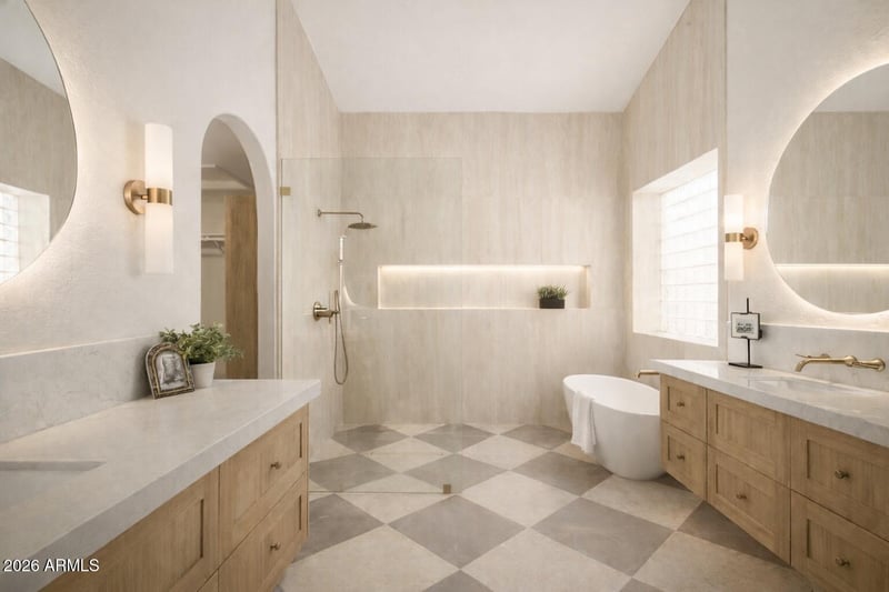 The primary suite and bath have been thoughtfully crafted as a private retreat, featuring striking large-format designer checkerboard tile, LED underlit floating his-and-her vanities with abundant storage, and a spacious walk-in closet designed to maximize every inch. The spa-inspired bath includes a zero-edge walk-in shower with a long, sleek niche softly illuminated by integrated LED lightingcreating a tranquil ambiance while providing just enough glow to guide your steps at night without the harshness of a bright overhead lightpaired with a solid-surface freestanding soaking tub for a serene, resort-like experience. Wall-mounted faucets and premium Delta hardware in a cohesive champagne bronze finish complete the space, showcasing the exceptional quality and attention to detail invested throughout this remodel.