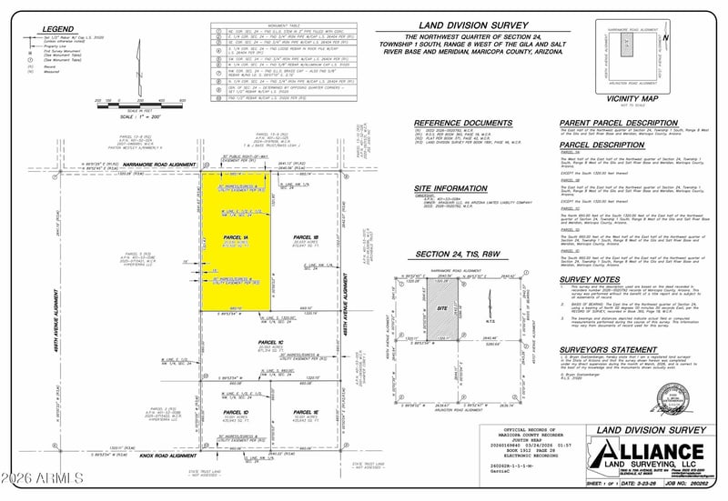 Listing details for 45722 Narramore Rd #-, Tonopah, AZ 85354 : JUST OVER 20 (20.03) ACRES FOR SALE SOUTH OF TONOPAH, AZ! PERFECT LOCATION FOR THOSE WHO PREFER OFF THE BEATEN PATH & RURAL WESTERN LANDSCAPES. OPPORTUNITY TO POSSIBLY SUB-DIVIDE INTO SMALLER PARCELS. ZONED R-190. LISTING FOR THE MARICOPA COUNTY PARENT PARCEL 401-53-008-A, REFERRED TO AS PARCEL 1A ON RECORDED SURVEY 2026-0169840.*SELLER MAY CARRY*BUYER TO VERIFY SCHOOLS, ZONING / USE, UTILITIES, ACCESS & ALL PERTINENT INFORMATION. DIRECTIONS: 435TH AVE/ELLIOT RD - NORTH ON 435TH AVE .9 MILES, WEST ON DOBBINS 2.88M, SOUTH ON WORLEY 1.5MILES, EAST ON CARVER RD 1.25 MILES, SOUTH TO NARRAMORE. PARCEL TO THE EAST JUST OVER ½ MILE. DO NOT USE ADDRESS TO LOCATE, MUST USE GIS MAPS & COORD 33.331298, -113.034231.