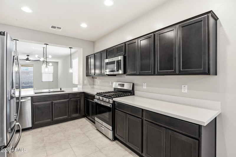 Listing details for 4589 Horsenettle Dr, San Tan Valley, AZ 85144 : Modern Comfort in San Tan Valley! Built in 2020, the kitchen showcases rich dark cabinetry paired with sleek quartz countertops, breakfast bar seating, stainless steel appliances & an eat-in dining area, plus new pendant lighting & new dishwasher. Flowing seamlessly into the dining & living areas with upgraded lighting & new ceiling fans, creating a bright, open feel. The generously sized primary suite features an ensuite with double vanity, updated fixtures & hardware, walk-in shower with new glass door, private toilet room with storage & a large walk-in closet. Three additional bedrooms provide comfortable space for family or guests, while the secondary bathroom features an oversized vanity and a shower/tub combination. The back yard features a covered patio & open slate grass area ready for customization, all set against beautiful mountain views. Additional highlights include a SimpliSafe camera system & plumbing prepped in the kitchen for a reverse osmosis system. Located in a desirable community with parks & playgrounds for the perfect blend of comfort, convenience & lifestyle!