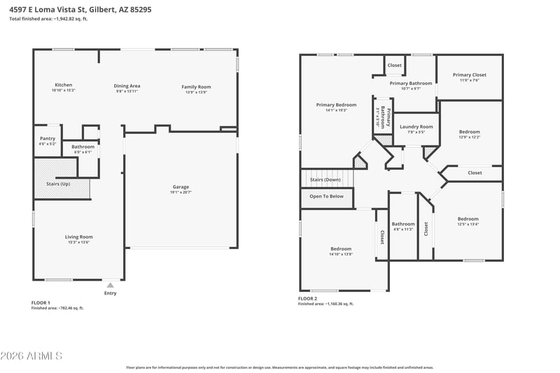 Listing details for 4597 Loma Vista St, Gilbert, AZ 85295 : Updated roof (2026) and AC Unit (2021) Welcome to your new Gilbert home in highly sought-after Gateway Village! This 4 bed, 2.5 bath home offers 2,159 sq ft on a corner lot with a private driveway and 2-car garage. An inviting layout with formal living, upgraded staircase, and a light-filled kitchen featuring white cabinets, Corian counters, island, and walk-in pantry. Kitchen flows into the breakfast nook and family room, perfect for entertaining! Upstairs primary suite overlooks the backyard with a spacious closet and ensuite bath. Three large secondary bedrooms + upstairs laundry! Front covered balcony with beautiful views. Private backyard with room to relax or entertain. Minutes to SanTan Village, parks, schools, and freeway access.