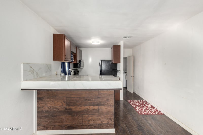 Listing details for 460 Spruell Ave, Coolidge, AZ 85128 : Seize the chance to own this charming 2-bedroom home in Coolidge! You're welcomed by a full-fenced lot and a front porch that sets an inviting tone. Inside, you'll find an appealing open layout with a soothing palette, blinds, and rustic wood flooring. The well-appointed kitchen includes ample wood cabinetry, essential built-in appliances, and a peninsula with tile counters and a breakfast bar for casual dining. Both bedrooms are cozy and well-sized, providing a private retreat for a good night's rest. Venture out onto the backyard, offering a covered patio, a basketball hoop, and abundant space for crafting your dream outdoor oasis. Don't miss out on this one!