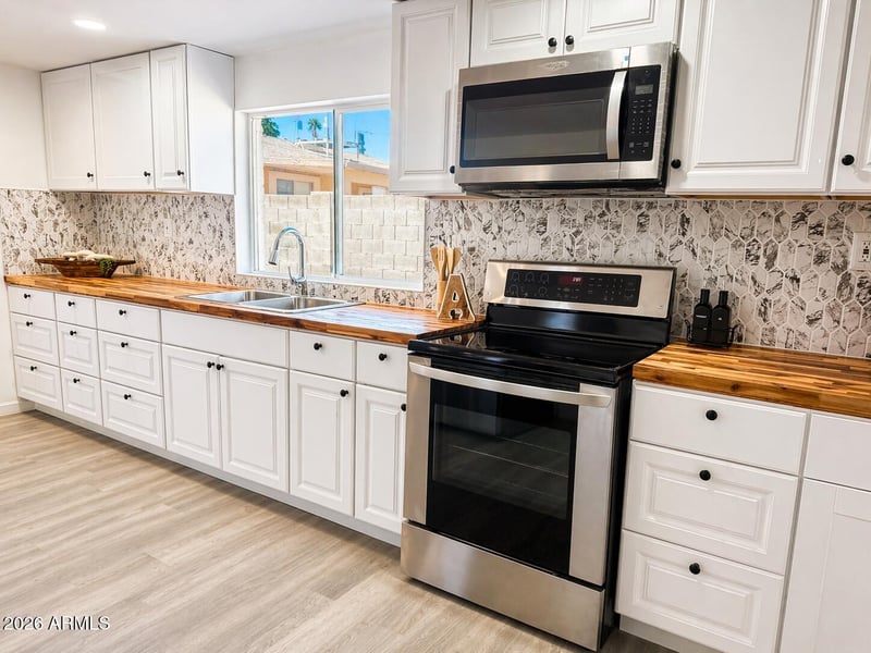 Listing details for 4602 8th St, Phoenix, AZ 85040 : Renovated 3-bedroom, 2-bath home with stylish upgrades throughout! The updated kitchen features beautiful butcher block countertops, tile backsplash, and new appliances. Both bathrooms offer tiled showers and attractive tile flooring. Spacious, well-sized bedrooms provide comfort and flexibility. Enjoy outdoor living with covered front and back porches, plus RV gates for added convenience. Energy-efficient solar panels will be fully paid off at closing, offering long-term savings. Move-in ready and packed with charm, this home blends modern finishes with everyday functionality.
