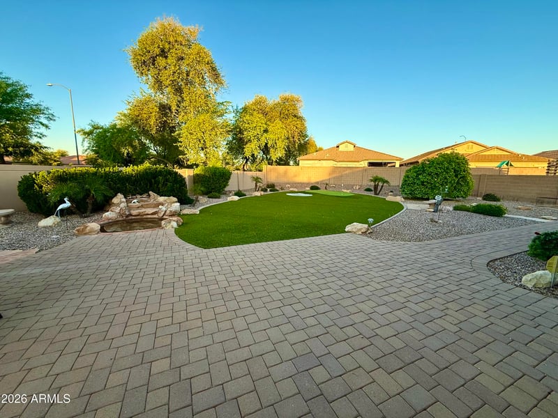 Listing details for 4607 Hassett Cir, Mesa, AZ 85212 : RARE! POSSIBLY the LARGEST LOT IN THE COMMUNITY....Almost 1/3rd acre! Cul-de-sac location nestles this Lovely Single Level Home with a 3 Car Garage. Cute Front Porch welcomes you as you enter this Desired Open Concept Floor plan. The Kitchen is highly upgraded with rich real wood cabinets, granite countertops, solid granite backsplash and all Stainless Steel Appliances including the Fridge. Oversized Island is perfect for Entertaining! Neutral Tile that has been professionally cleaned flows throughout the home except for the Bedrooms which have BRAND NEW luxury carpet. Home has been freshly painted inside and recently on the Exterior. Windows have BRAND NEW 2'' blinds throughout. This home is truly Move In Ready! Step Outside and You will Certainly be Impressed. Not only is the Yard Spacious but it is beautifully done. Covered Patio with Brick Pavers extends to your outdoor built in BBQ. Relax by the soothing fountain or test your skills on your personal Putting Green. Lush Mature Trees and Fruit Trees throughout with a very private feel neighboring only single level homes. Side Yard has spacious Storage Shed as well as brick extended slab through double composite wood utility gate. Do you ever see those couple of homes with the Premium Lot in a neighborhood and think .....Wow wish I had that home...Well here is your Chance!!!