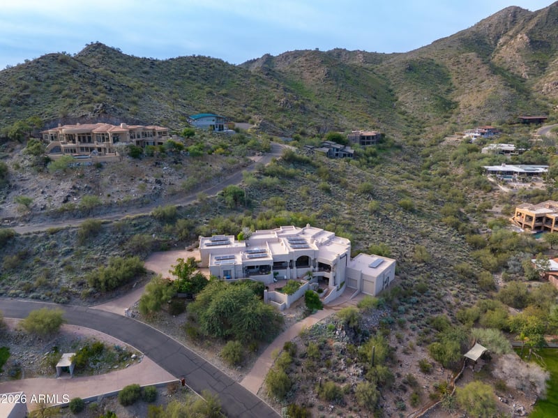 Listing details for 4616 White Dr, Paradise Valley, AZ 85253 : Draped along a dramatic hillside within Paradise Valley's coveted Phoenix Mountain Preserve, this timeless estate commands powerful, elevated Northwest-to-East views of rugged mountain ranges, twinkling lights, vibrant desert skies, and captivating nighttime sparkles. A true car enthusiast's dream, the property offers four garages with parking for nine vehicles, including an RV-sized bay. Southwest grandeur defines the architecture, showcasing hand-carved vigas, corbels, and doors, graceful arched passageways, forged iron fixtures, soaring ceilings, and magical vistas framed from nearly every window, all surrounded by mature, lush desert landscaping. Cascading naturally along the hillside, the main residence welcomes you through an impressive entry corridor highlighted by a tranquil fountain. Arched doors open to a prominent entry overlooking the grand great room, where a striking floor-to-ceiling fireplace anchors the space alongside an inset wet bar with wine cellar and expansive walls of glass capturing the northern horizon. The formal dining room and gourmet kitchen share this level, offering a spacious island, fireplace, and casual dining areaideal for both entertaining and everyday living. Privately split from the main living areas, the Primary Retreat lives like a home unto itself, featuring a spacious bedroom with patio access, spa-inspired bath with dual vanities and soaking tub, a separate office, den, or an inviting reading room. A guest ensuite with fountain patio access is thoughtfully positioned near the entrance, offering exceptional privacy. Stretching the length of the home, the outdoor patio provides covered living and dining spaces perfect for alfresco entertaining or quiet morning coffee, all set against serene desert vistas. Just below, a lagoon-style pool awaits, along with a spacious guest home offering additional garage access, mini kitchen, den with fireplace, and a separate bedroom or flex space. Traditional Spanish finishes throughout enhance the authenticity of this exceptional hillside residence. Ideally located near Tatum and Sunset, this rare Arizona estate offers privacy, character, and effortless access to Scottsdale and Phoenixan extraordinary opportunity to experience elevated desert living at its finest.