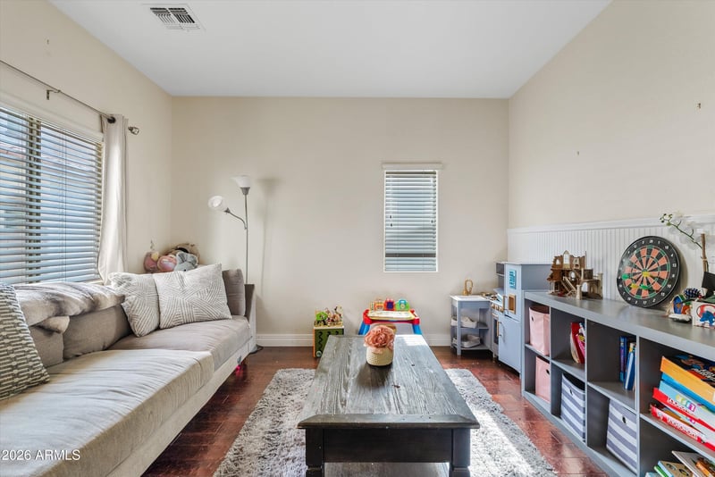 A front entry flex space provides versatile use as a den, playroom, or home office. The two-car garage includes a hidden third garage/storage area for added functionality. Step outside to a spacious backyard with no rear neighbors, ideal for enjoying Arizona living. A central vacuum system adds everyday convenience.