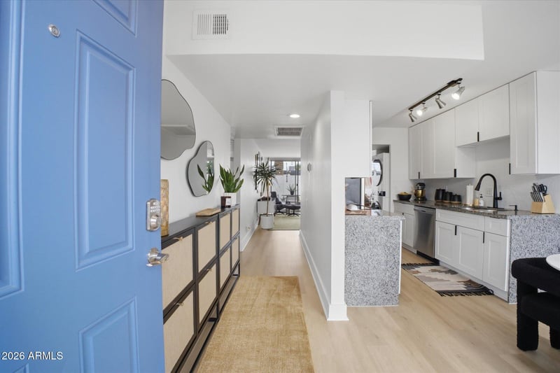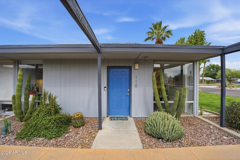 Listing details for 4646 11th Ave #110, Phoenix, AZ 85013 : A favorite saying among mid-century enthusiasts is ''What would Beadle do?'' - and the answer is simple: purchase this residence and embrace the ultimate desert modern lifestyle! Located in the vibrant and highly desirable Grandview Neighborhood -affectionately known as the ''Neighborhood with Heart'' - this rare end-unit condo sits in the heart of the Melrose District, just moments from the iconic Melrose Mile along 7th Avenue with its beloved coffee shops, dining, bars, and vintage boutiques. Enjoy close proximity to Tawa Park at the end of the complex, along with easy access to light rail, major freeways, Downtown Phoenix (approximately 12 minutes), and Sky Harbor Airport. Designed by legendary mid-century modern architect Alfred Beadle, this prime end unit is a true Beadle Box - a rare opportunity to own an authentic piece of Phoenix architectural history within a small, boutique garden-style community of just 27 residences. With only one shared wall, no neighbors above or below, and solid block construction, the home lives more like a single-family residence: private, quiet, and filled with natural light. The unit backs to the community pool and lush grass area, offering added privacy and serene views. Inside, iconic mid-century details shine with slump block walls, clean lines, and expansive floor-to-ceiling glass doors and windows that create a bright, airy atmosphere. Fully updated and completely move-in ready, the home features new LVP flooring throughout, fresh interior paint, custom top-down/bottom-up window shades, new lighting, fans, fixtures, and an Ecobee smart thermostat. The updated kitchen blends style and function with stainless steel appliances (including a new dishwasher), waterfall-edge granite countertops, and seamless indoor/outdoor flow. Large sliding glass doors open to a private covered patio, perfect for enjoying Arizona's beautiful weather year-round.
